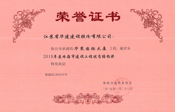 华策国际大厦获2018年度珠海市建设工程优质结构奖