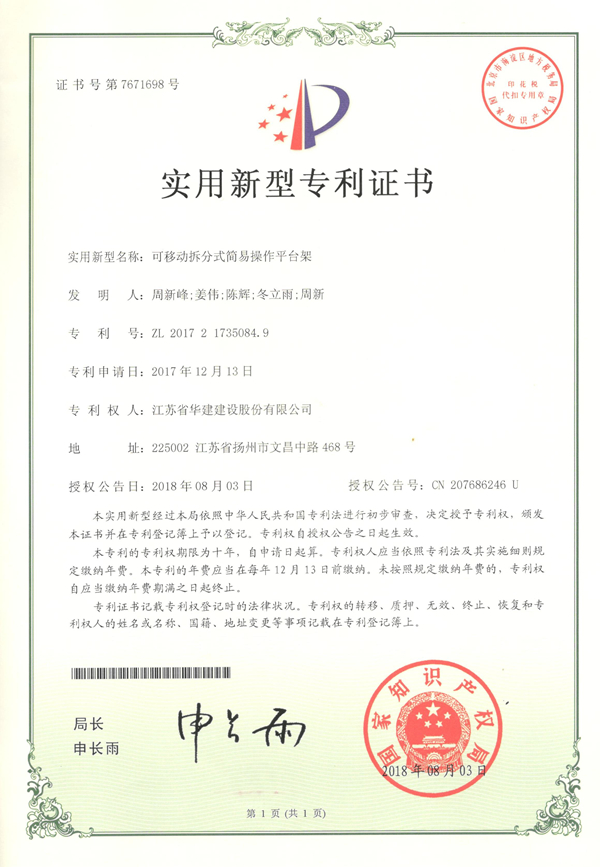 北京公司获一项实用新型专利 时间:2018-09-07 2818 近日,从国家知识产权局传来喜讯,北京公司发布的《可移动拆分式简易操作平台架》(专利号:ZL201721735084.9)获得实用新型专利。