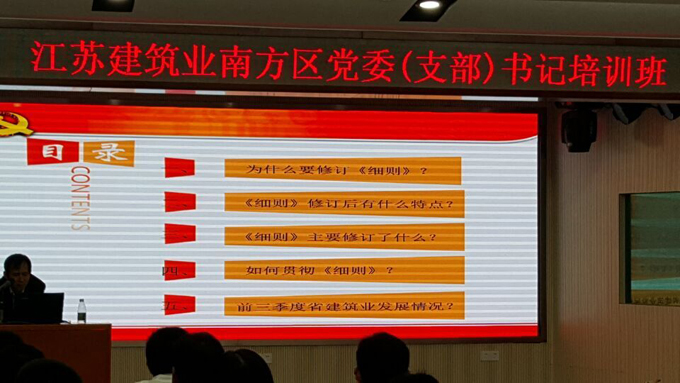 会上,江苏省住房和城乡建设厅机关党委副书记丁舜祥针对《中国共产党发展党员工作条例》作了专题讲座,详细讲解工作条例的主要内容和特点、发展党员工作的总要求、发展党员工作的基本原则、党员发展的条件标准、发展党员的主要流程等方面内容,并针对南方地区基层组织发展中存在的一些问题提出了明确要求。江苏省住房和城乡建设厅驻南方办事处主任朱跃斌传达了《住建厅党组书记顾小平在广东省调研重要讲话指示精神》以及《住建厅驻外办事处民工工资清欠工作精神》,并对建筑企业的进一步发展提出了指导性意见。