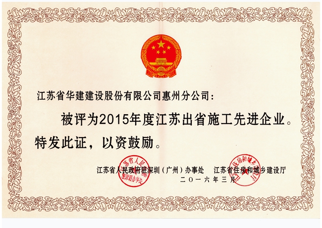 惠州公司荣获“2015年度江苏出省施工先进企业”称号 时间:2016-03-26 2748 3月24日,江苏省人民政府驻深圳(广州)办事处和江苏省住房和城乡建设厅在南宁召开2016年江苏建筑业南方区工作会议,表彰了一批施工先进企业、优秀企业经理、优秀建造师和先进个人。惠州公司获评“2015年度江苏出省施工先进企业”,总经理华恒荣被评为优秀企业经理,陈申高被表彰为质量安全先进个人,杨猛被表彰为经营财务先进个人。