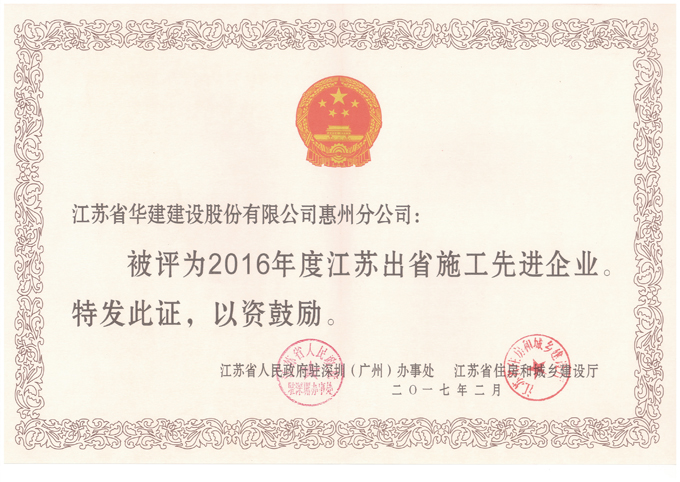 惠州公司荣获“2016年度江苏出省施工先进企业”称号 时间:2017-03-28 2583 3月24日,江苏省人民政府驻深圳(广州)办事处和江苏省住房和城乡建设厅在海口召开2017年江苏建筑业南方区工作会议,表彰了一批施工先进企业、优秀企业经理、优秀建造师和先进个人。惠州公司获评“2016年度江苏出省施工先进企业”,总经理周群利被评为优秀企业经理,黄秀刚被表彰为质量安全先进个人,邵群斌被表彰为经营财务先进个人,刘磊被表彰为新闻报道先进个人。
