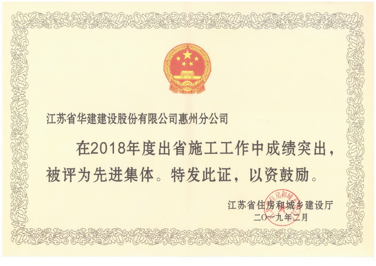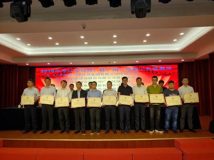 会议表彰了一批江苏出省施工先进集体及先进个人。其中,惠州公司被江苏省住房和城乡建设厅表彰为2018年度江苏出省施工先进集体,总经理周群利、技术质量处主任陈申高被江苏省住房和城乡建设厅表彰为2018年度江苏出省施工先进个人;黄秀刚、邵群斌、王兴东分别被江苏省人民政府驻深圳(广州)办事处表彰为2018年度江苏进粤、桂、闽、琼施工质量安全、经营财务和新闻报道先进个人。
