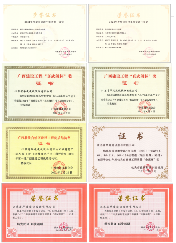 2022年度,北京分公司技术成果和质量创优表现非常突出。截至目前,技术成果方面共获得七项国家奖项和八项省级奖励,质量创优方面,共获得两项省级优质工程、两项省级优质结构和市优质工程三项。具体而言,BIM成果共获两项国家奖项,QC成果获一项国家奖项及七项省级奖项,申请专利获得四项国家实用新型专利授权,新技术应用示范工程获一项省级奖项,项目工程方面绿城杨柳郡柳园1#-4#及地下室工程和绿城杨柳郡柳园5#-7#及地下室工程分获广西建设工程“真武阁杯”奖(最高质量奖),中海天钻11#-14#及地下室工程和杨柳郡华园1-7#楼及地下室分获广西建设工程优质结构奖,中海天钻3#、5#、6#楼及地下室和中海天钻2#、7#、8#楼及地下室分获柳州市建设工程“龙城杯奖”,中海河山郡(北区)一标段5#、6#、9#-11#、16#-19#住宅楼获包头市建设工程质量“金鹿杯”奖。