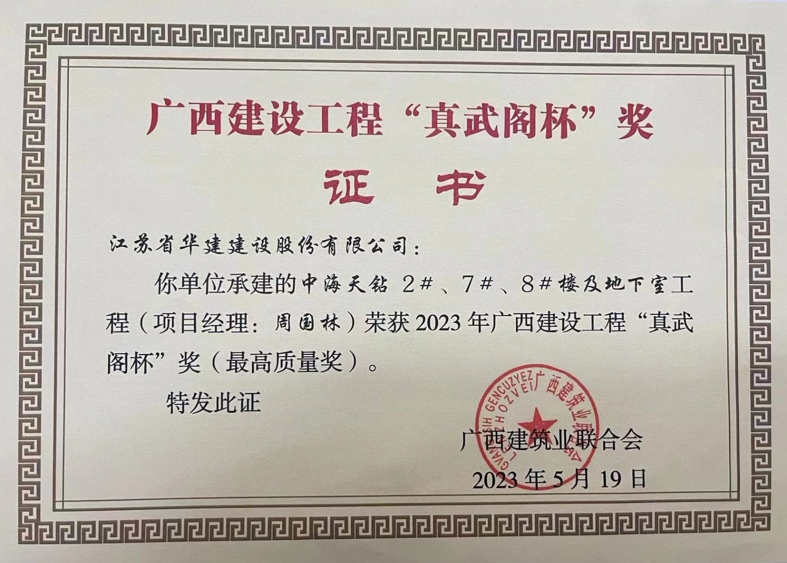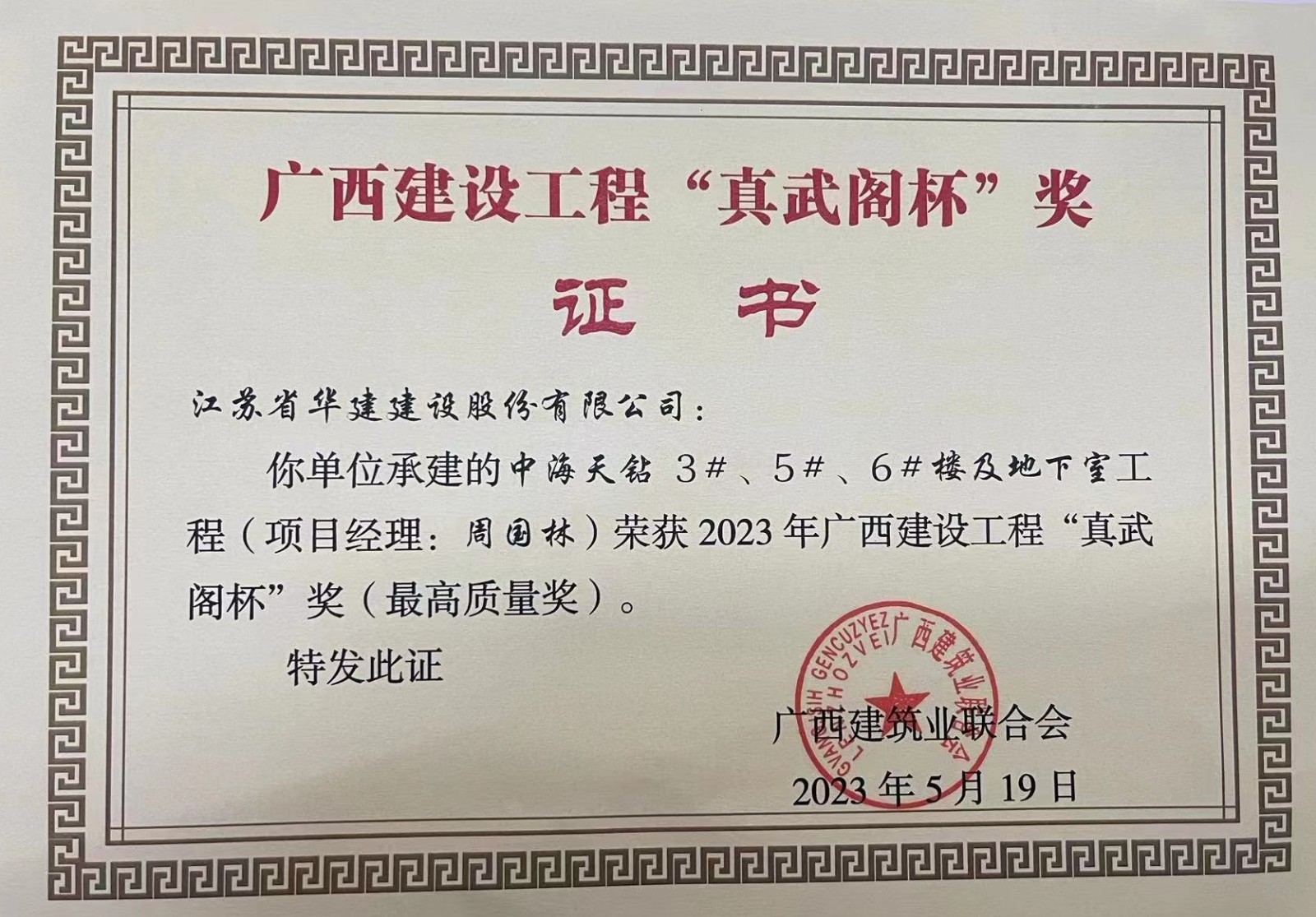 北京分公司两项工程荣获2023年广西建设工程“真武阁杯” 奖(最高质量奖) 时间:2023-06-13 2633 近日,广西建筑业联合会网站公布了《关于公布2023年广西建设工程“真武阁杯”奖(最高质量奖)工程名单的通知》,由公司承建的中海天钻3#、5#、6#楼及地下室工程、中海天钻2#、7#、8#楼及地下室工程名列榜单。下一步,公司将进一步提高创新创优意识,提升项目精细化管理水平,以匠心精神打造更多优质工程,持续擦亮华建品牌。