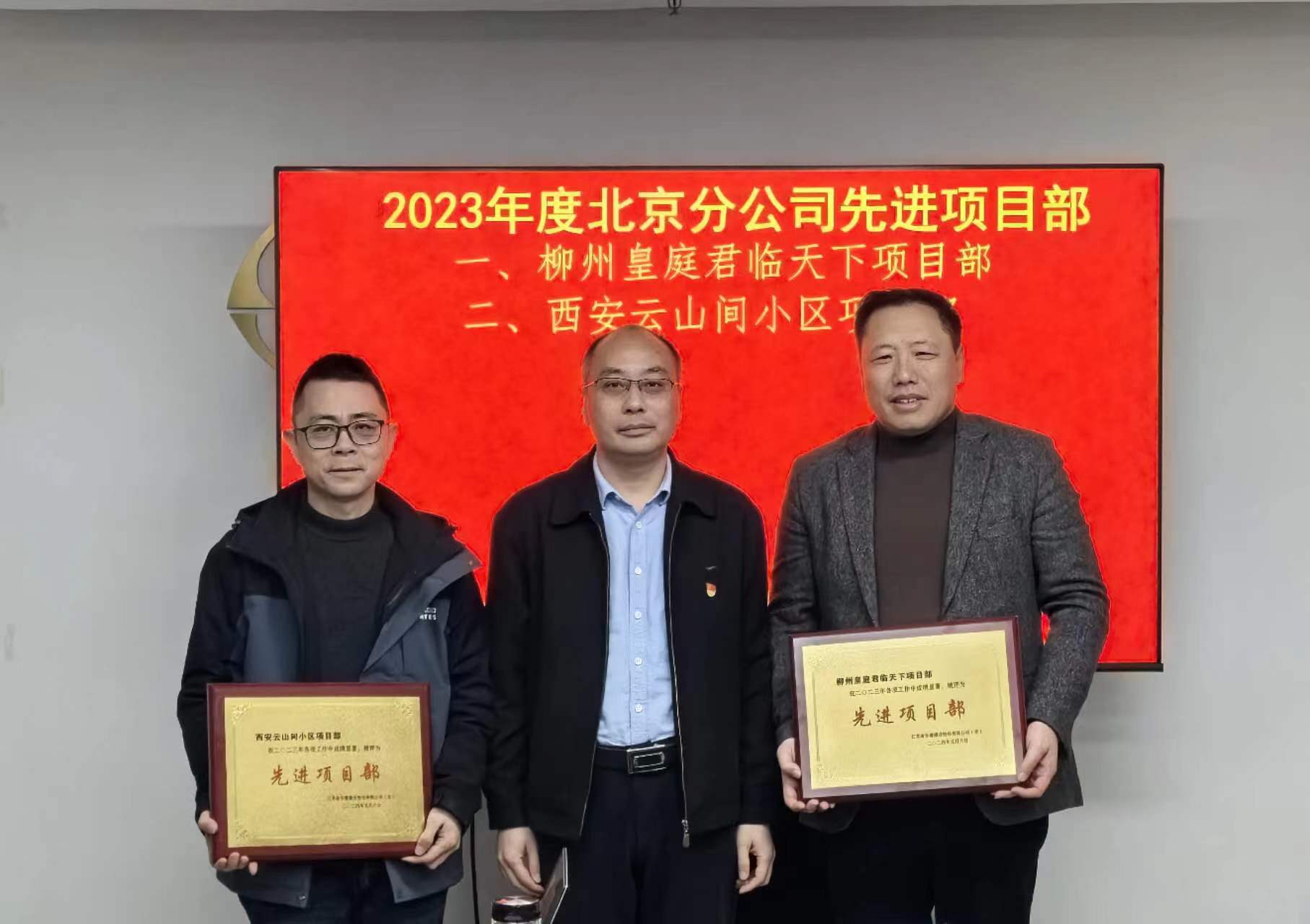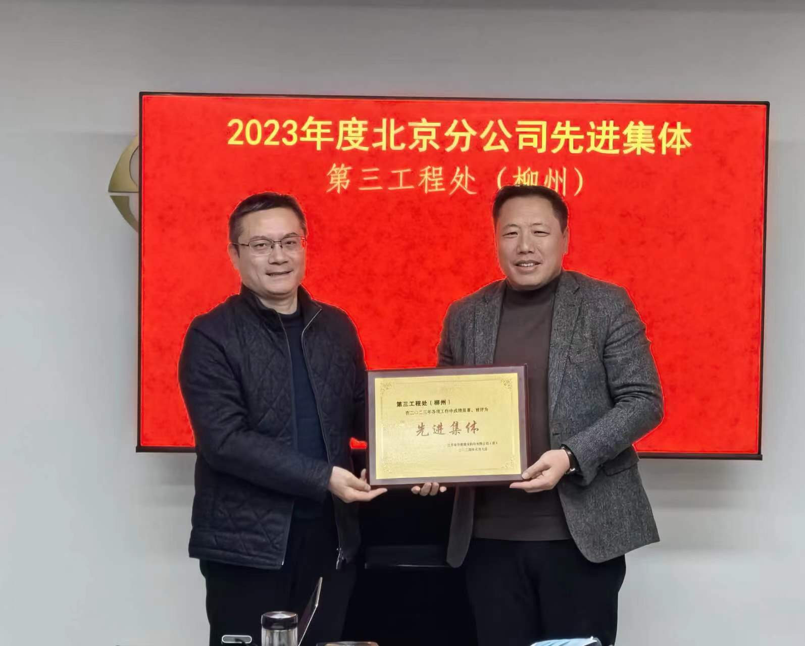 副总经理陈永明宣读关于表彰公司2023年度先进集体和先进个人的决定,戴壮民、朱靖为获奖工程处代表进行颁奖并合影。