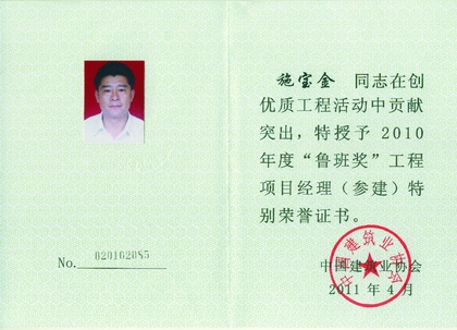 施宝金 时间:2012-04-10 7495 施宝金,高级工程师,现任深圳公司七处二工区常务副主任、项目经理。1996年到深圳参加工作,参与过国际商会中心、荣超经贸中心、江胜大厦、绿景纪元大厦等重点项目施工,获“深圳市建筑业企业优秀项目经理”称号,被授予“创鲁班奖工程项目经理特别荣誉证书”。