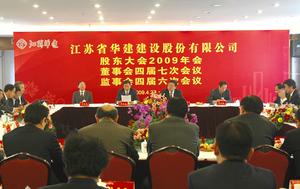 4月27日,公司股东大会2009年度年会、董事会四届七次会议、监事会四届六次会议在扬州召开,15个股东出席会议,公司董事会、监事会成员参加会议,公司部分高级管理人员列席会议。会议听取和审议了公司副董事长、总经理宗有农所作的董事会和经营层工作报告;副总经理程杰所作的关于特级资质就位情况工作专题报告;监事会主席邢建安所作的监事会工作报告;公司副总会计师李长栋所作的关于2008年度财务报告及2009年度财务预算方案(草案)的报告,关于2008年度利润分配方案(草案)的报告以及股东大会议事规则、董事会工作规则、监事会工作规则等三个草案;副董事长、副总经理陈荣春所作的关于董事会、监事会成员调整的提案说明。会议经投票,表决通过了上述报告、方案,增选李幼杰同志为公司第四届董事会董事,潘巧宏为公司第四届监事会监事。