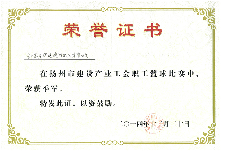 公司篮球队获市建设产业工会篮球赛季军 时间:2014-12-22 3882 12月20日,在扬州市职业大学瘦西湖校区体育馆举办的“扬州市建设产业工会篮球比赛”中,由总部机关、设计院和检测中心职工组成的公司篮球队努力拼搏、奋勇争先,以两胜一负的战绩荣获比赛季军。 建设产业工会田主席为公司篮球队颁发奖状