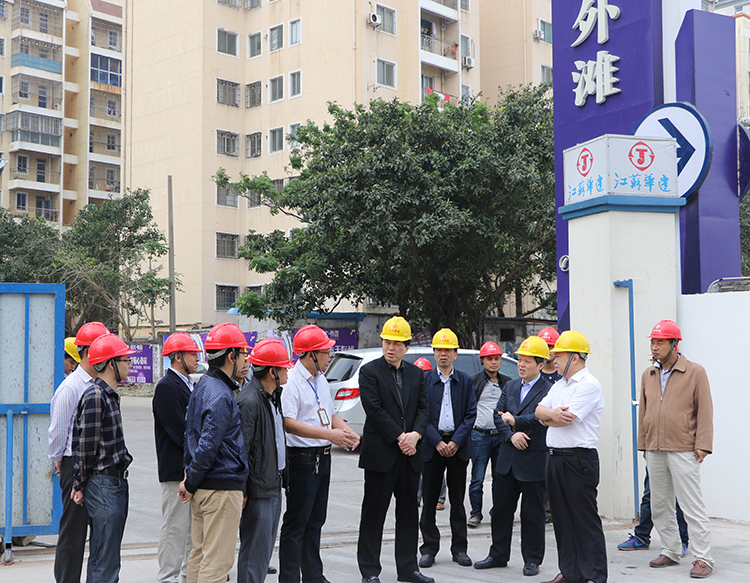 在公司承建的恒大外滩中心施工现场,朱市长与项目管理人员一一握手,向大家表示亲切问候。在陪同人员引导下,他饶有兴致地边走边看,听取项目负责人对工程特点、工程进展、工程用材等方面的情况汇报,不时点头称赞施工人员的工艺水平和施工技艺,并与项目部主要管理班子亲切合影。