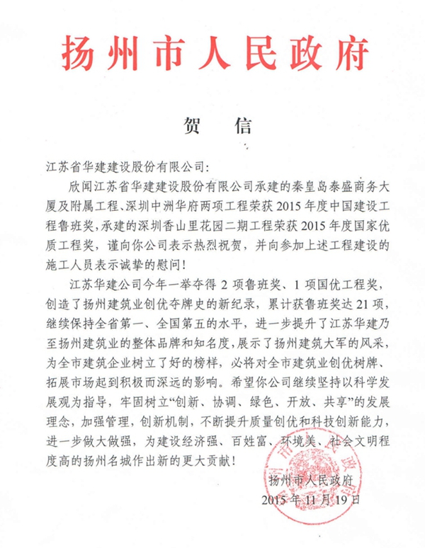 贺信中说,半岛官网入口网页版公司今年创造了扬州建筑业创优夺牌史的新纪录,进一步提升了半岛官网入口网页版乃至扬州建筑业的整体品牌和知名度,展示了扬州建筑大军的风采,为全市建筑企业树立了好的榜样。希望华建牢固树立“创新、协调、绿色、开放、共享”的发展理念,加强管理,创新机制,不断提升质量创优和科技创新能力,进一步做大做强,为建设经济强、百姓富、环境美、社会文明程度高的扬州名城作出新的更大贡献!