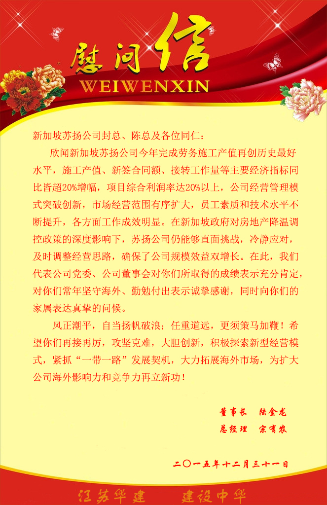12月份,公司总部完成了对国内各区域公司、控股和参股子公司各大板块的年终走访调研,新加坡苏扬公司特地通过电子稿汇报了2015年工作情况及下年度工作思路。2015年新加坡苏扬公司主要经济指标均创历史新高,实现了施工产值、新签合同额、接转工作量、项目预结算利润四个超“千万”(其中前三项为新加坡元);市场经营范围有序扩大;员工素质和技术水平不断提升;积极探索尝试规模效益之路,收到了很好的成效,确保了规模效益持续稳定增长。总部认为这一年来苏扬公司直面挑战,冷静应对,取得了较好成绩,公司董事长陆金龙、总经理宗有农特发慰问信勉励苏扬公司再接再厉、再立新功!