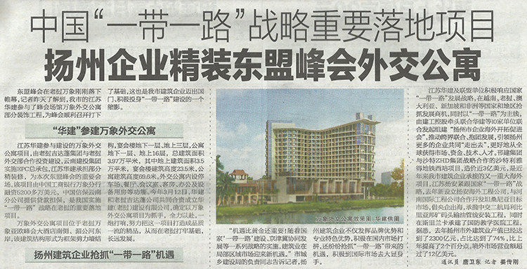 9月12日《扬州晚报》刊载华建东盟峰会外交公寓项目消息 时间:2016-09-12 3749 近日,东盟峰会在老挝万象刚刚落下帷幕。9月12日,《扬州晚报》A7版刊载题为《中国“一带一路”战略重要落地项目 扬州企业精装东盟峰会外交公寓》的文章,详细报道华建积极践行国家“一带一路”战略,承建东盟峰会场馆万象外交公寓精装修工程的有关情况。