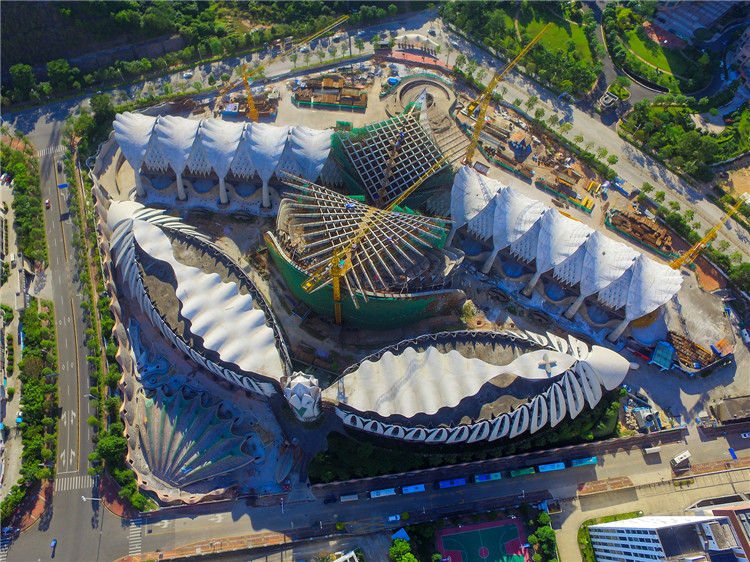 深圳玛丝菲尔工业厂区工程总建筑面积约11万m2,工程主体为钢与钢筋混凝土组合异型结构,外部及屋顶由对称布置的56个双曲面混凝土叶片结构围护,建筑外表面采用碎拼面砖、砖片、石块作为装饰,为国内目前面积最大的仿生艺术建筑。工程中双曲叶面、背叶面、旋转坡道、异形柱等钢结构造型复杂,钢结构构件加工制作尺寸控制难度大、精度高。项目部与设计院联合攻关,在该项目迄今为止已获得8项发明专利,24项实用新型专利,创国家级工法1项、省级工法6项。两次迎接国内同行的大规模学习观摩。
