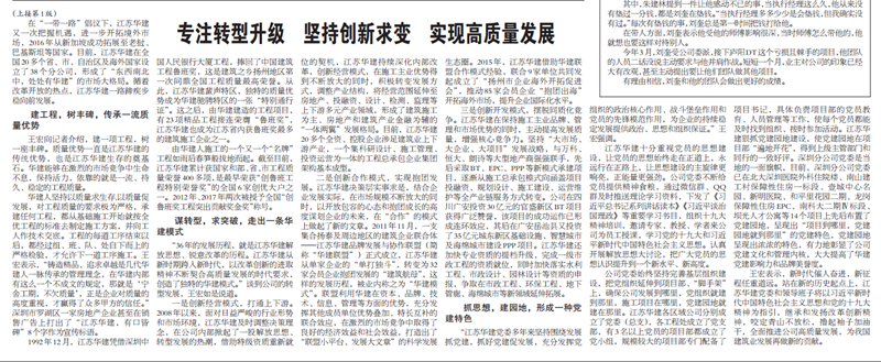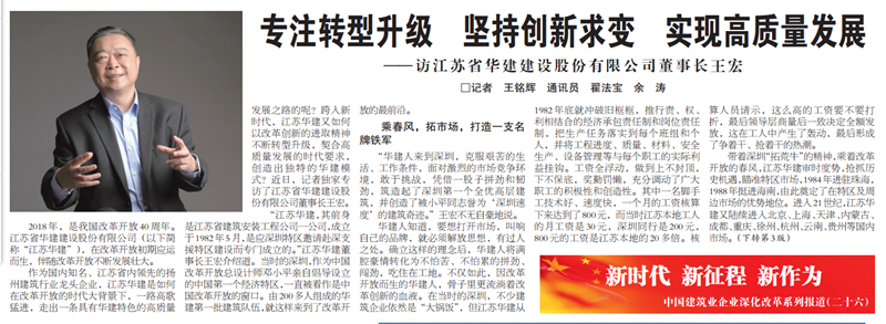 王宏董事长接受《建筑时报》专访:专注转型升级,坚持创新求变,实现高质量发展 时间:2018-09-11 3888 9月10日,《建筑时报》头版及微信公众号对王宏董事长的专访给予了刊载。 王宏董事长在专访中就半岛官网入口网页版成立36年来,是如何在改革开放的时代大背景下,走出一条具有华建特色的高质量发展之路,跨入新时代,江苏华建又是如何以改革创新的进取精神不断转型升级,契合高质量发展的时代要求,创造出独特的华建模式进行了详细介绍。