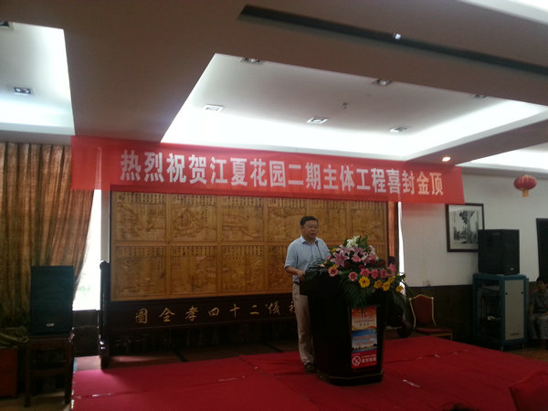湖北公司江夏花园二期项目顺利封顶 时间:2015-06-30 2593 6月28号,是湖北分公司值得庆祝的日子:公司在武汉市承建的第一个民用住宅江夏花园二期工程顺利封顶。该工程项目地处居民集中区,其施工空间狭小,工期紧迫。湖北公司组织强有力的项目管理团队,精心筹备,克服各种困难,保质保量的完成了工程既定目标。 公司副总经理、海南区域公司总经理王宏出席封顶仪式并致辞,对各参建单位表示感谢,对项目部取得的成绩表示肯定并希望大家再接再厉,确保顺利竣工。