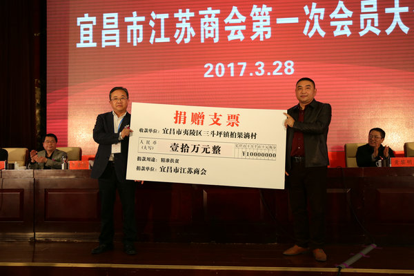 会议选举产生了商会第一届领导班子,公司副总经理陆俊当选首任会长,通过公司董事长王宏为宜昌市江苏商会第一届名誉会长。为帮助贫困村脱贫攻坚,宜昌市江苏商会现场向夷陵区三斗坪镇柏果淌村捐赠帮扶资金10万元。