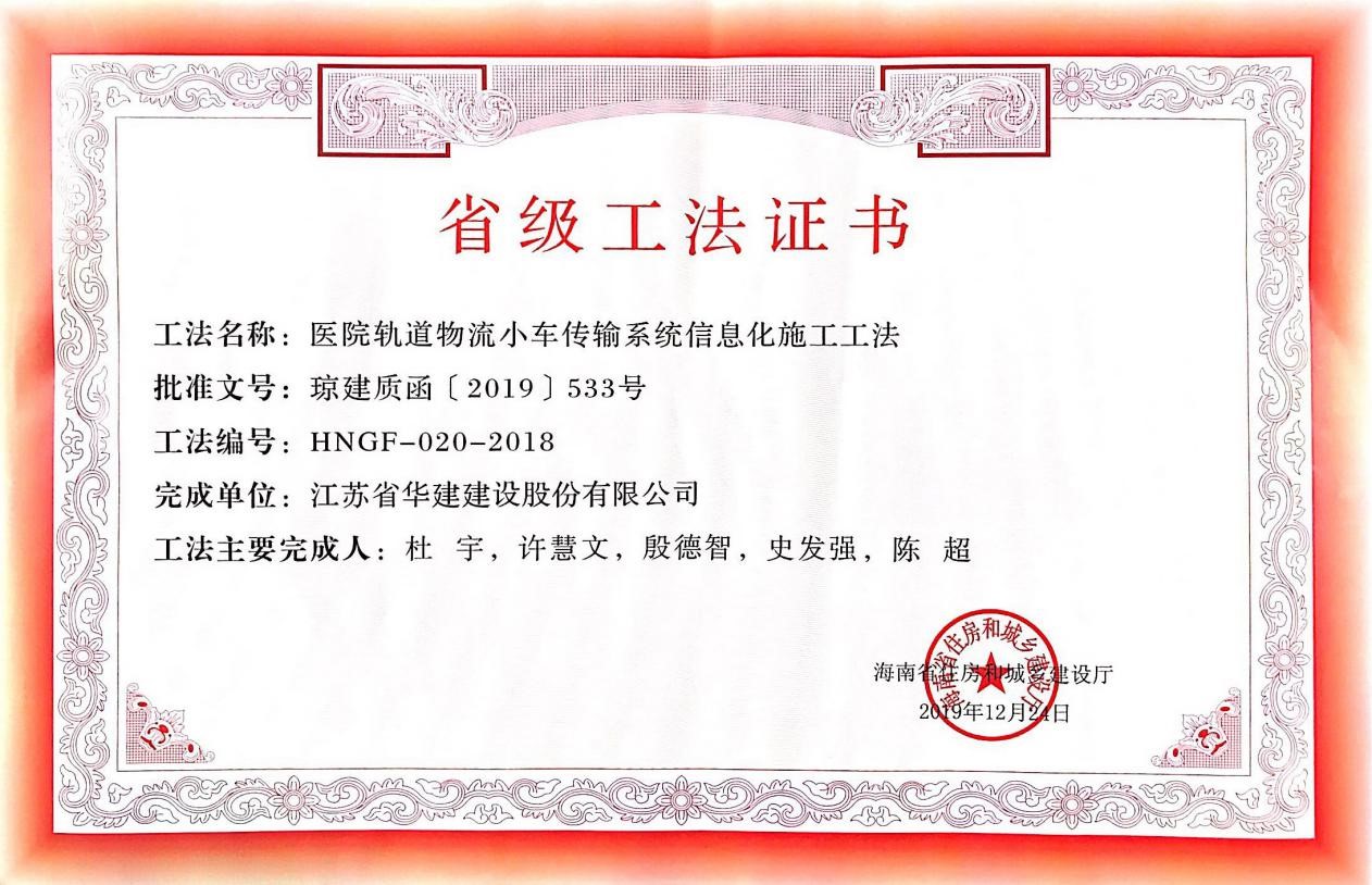 海南分公司新增1项省省级工法 时间:2020-01-10 3254 2019年12月24日,海南省住房和城乡建设厅公布了2018年度海南省省级工法评审结果,我司《医院轨道物流小车传输系统信息化施工工法》成功入选。