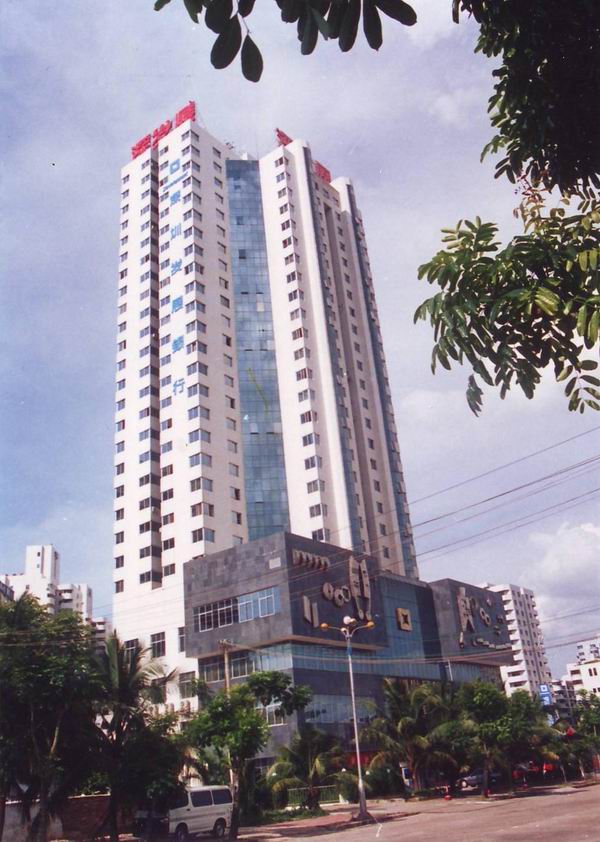 该工程共28层,其中地下2层,建筑总高度105.05m,建筑面积31890m2,框支剪力墙结构体系。工程地下二层为人防,地下一层为停车场,一至四层为办公写字间,四至五层设转换层,兼作设备通风层,五至二十六层为住宅。大厦设备齐全,有中央空调、3台进口电梯、进口卫生洁具、共用电视天线、消防控制中心等。外装饰,一至四层为进口蓝宝石花岗岩,五至二十六层为白色条形面砖及铝合金窗。内装饰,五至二十六层楼地面为拼木地板,客厅房间墙面及顶棚为多彩喷涂,卫生间、厨房间为釉面砖墙及防滑地面砖,采用轻钢龙骨石膏板吊顶。