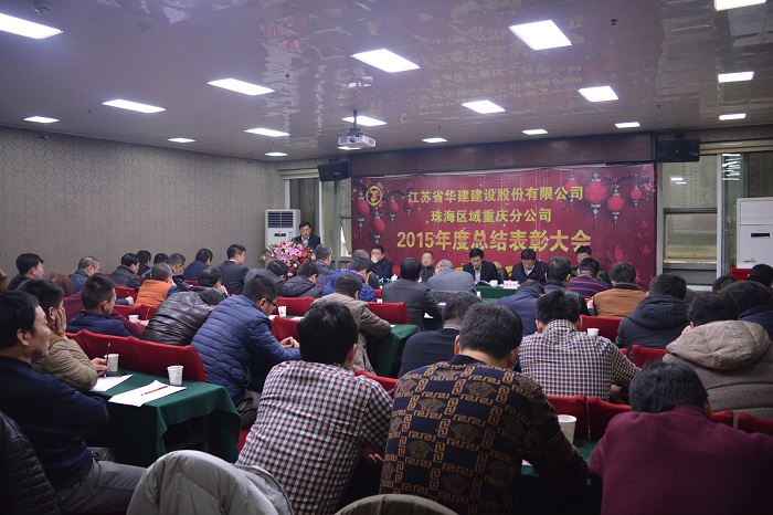 1月20日下午,重庆分公司组织召开2015年度总结表彰大会,江苏省住建厅驻西南办事处主任钱明,公司总部领导吴士茂、程杰、李长栋等出席,各工程处、项目部代表及公司机关全体近100人参加会议。缪国枢总经理主持会议。
