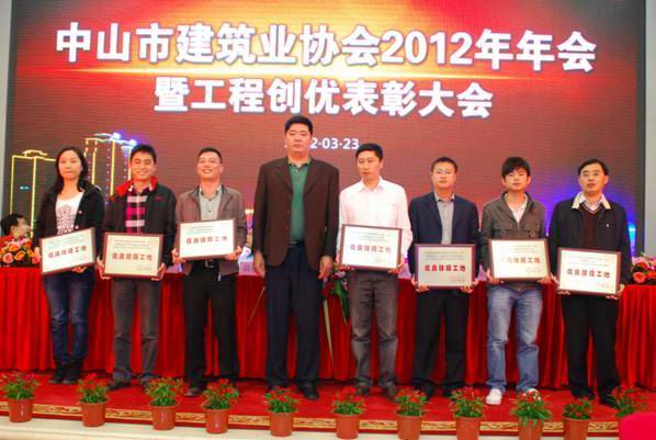 龙湾花园一期项目荣获“中山市安全生产文明施工优良样板工地”称号 时间:2012-04-11 4839 龙湾花园一期项目荣获“中山市安全生产文明施工优良样板工地”称号 2012年3月23日,中山市建筑业协会召开了“2012年年会暨工程创优表彰大会”。与会501家会员单位中,共有25个项目获得了“中山市建设工程安全生产文明施工优良样板工地”称号,由珠海区域公司中山分公司施工的“龙湾花园一期”工程项目榜上有名。 珠海区域公司中山分公司总经理严正涛(右一)在表彰会现场领取奖牌