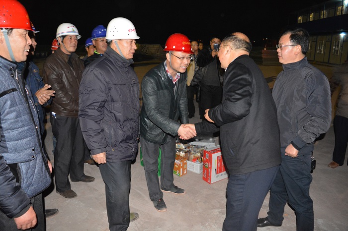 夜幕降临,新区施工片区灯火通明,机械运转声此起彼伏。据统计,当晚项目共计约250人,各类机械设备140多台参与加班作业,整个片区俨然一派热火朝天的景象。晚9时许,广安区委书记文建平率广安区四套班子有关人员分别来到方坪大道、盛世芳庭、官盛春天以及莲花大道等施工现场,给正在加班加点施工作业的全体员工送来面包等食品和饮料,对他们不惧严寒坚持作业的辛勤付出表示衷心感谢和慰问。他强调,新区美好家园安置房标准高,百姓给予了很大期待。华建作为施工单位,抢晴天,占雨天,不分白天黑夜坚持作业,为本地百姓干了实事,做出了贡献。他同时指出,新区项目管理规范,员工统筹到位,各级领导参观后多有赞扬,“是实实在在的标准化工地”。文书记最后勉励大家,新区项目建设进展快,质量好,百姓也满意,希望项目上下再加油,保质量保安全保进度,共同建设好官盛新区项目。