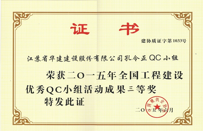 6月23—25日,由中国建筑业协会举办的“2015年全国工程建设优秀QC小组活动成果交流会”在云南昆明举行。珠海区域公司“江苏省华建建设股份有限公司孔令正QC小组” 经江苏省建筑行业协会推荐参加交流会,其成果《剥蚀丘陵地貌多形截面钢筋混凝土灌注桩施工新方法》荣获中建协QC成果三等奖。中国建筑业协会QC成果奖是建筑领域QC成果最高奖项,该奖项的获得是对公司在技术质量管理工作方面的充分肯定。此外根据该项成果编写的工法还获得2014年度江苏省省级工法。