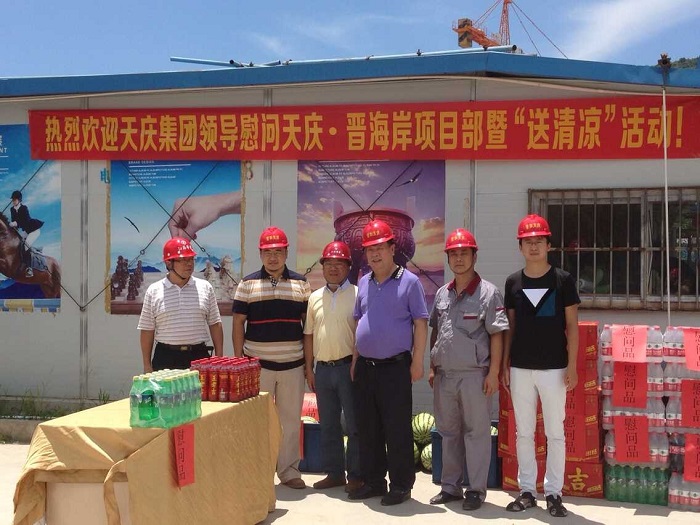 千里送清凉——天庆集团董事长韩庆慰问我司一线职工 时间:2015-08-05 3810 8月4日中午,烈日当空,骄阳似火。甘肃天庆房地产集团有限公司董事长韩庆一行不远千里来到广东珠海,顶着烈日,冒着酷暑,在项目负责人陈建的陪同下,慰问我司承建的“天庆·晋海岸”项目一线施工人员,给工人们送来了西瓜、矿泉水、王老吉等饮品和深情问候,让广大一线职工在炎炎烈日下感受到阵阵清凉。
