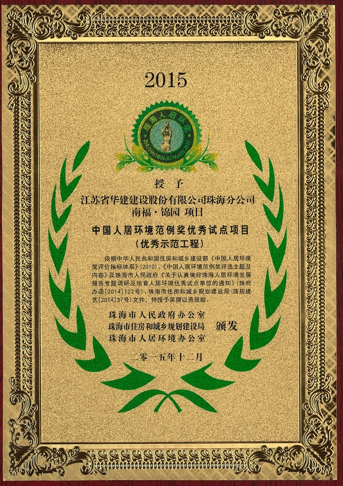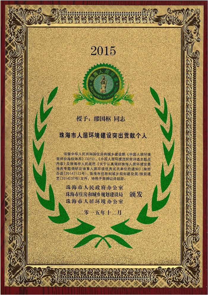 公司荣获珠海市人居环境建设突出贡献单位等四项表彰 时间:2015-12-22 3979 近日,珠海公司被珠海市人民政府办公室、珠海市住房和城乡规划建设局和珠海市人居环境办公室联合表彰为珠海市人居环境建设突出贡献单位(优秀建筑施工企业),缪国枢总经理被授予珠海市人居环境建设突出贡献个人称号,由我公司承建的拱北海关业务技术综合楼及南福·锦园项目荣获中国人居环境范例奖优秀试点项目(优秀示范工程)。