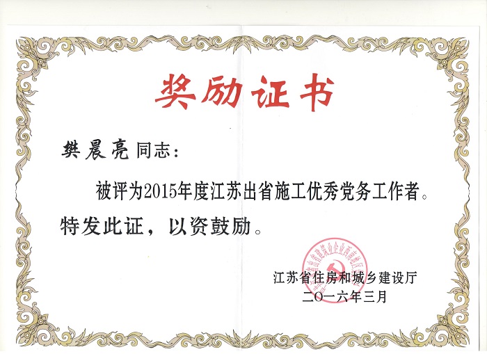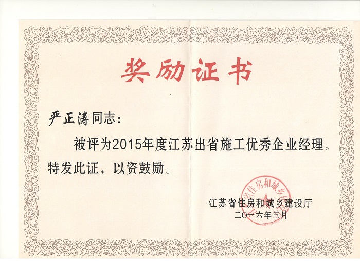 重庆分公司被表彰为“2015年度江苏出省施工先进企业” 时间:2016-04-20 2770 近日,重庆分公司被江苏省住房和城乡建设厅表彰为“2015年度江苏出省施工先进企业”,重庆分公司总经理严正涛荣获“2015年度江苏出省施工优秀企业经理”称号,樊晨亮被评为“2015年度出省施工优秀党务工作者”。