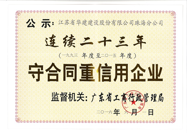公司连续二十三年被广东省工商行政管理局表彰为“守合同重信用企业“ 时间:2016-07-21 2642 近日,珠海公司被广东省工商行政管理局授予“连续二十三年守合同重信用企业”荣誉称号。 连续二十三年获得“守合同重信用企业”的荣誉称号,是政府主管部门和行业的认可和鼓励,这份荣誉将鞭策珠海公司将诚实守信、合法经营的企业理念一如既往地灌输到每一个工程建设中去,持续做好企业诚信体系建设,保持自身竞争优势,树立守法履约的良好施工企业形象。 目前,珠海公司评选的国家级守合同重信用企业正在公示。