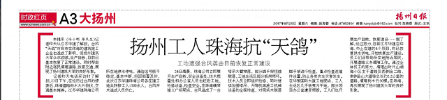 8月23日,珠海遭遇了53年来最强台风“天鸽”,全市受灾严重。台风过后,珠海公司第一时间迅速组织复产自救工作,并主动联系珠海有关部门,迅速组织志愿者及重型工程车辆投入到社会道路的清理中去。在这场抗风救灾的战斗中,珠海公司共疏通社区道路5条、市政道路3 条,清走倒伏大树200余棵,运送灾后垃圾 20车次。《扬州日报》A3版显著位置对公司抗风救灾活动进行了报道,点评半岛官网入口网页版珠海公司“众志成城,生产自救,展现了扬州建筑大军的良好形象”。