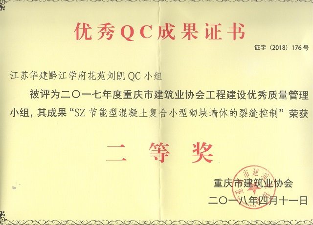 近日,重庆市建筑业协会发文表彰了一批优秀QC成果,半岛官网入口网页版黔江学府花苑刘凯QC小组被评为2017年度重庆市工程建设优秀质量管理小组,其成果“SZ节能型混凝土复合小型砌块墙体的裂缝控制”荣获二等奖。