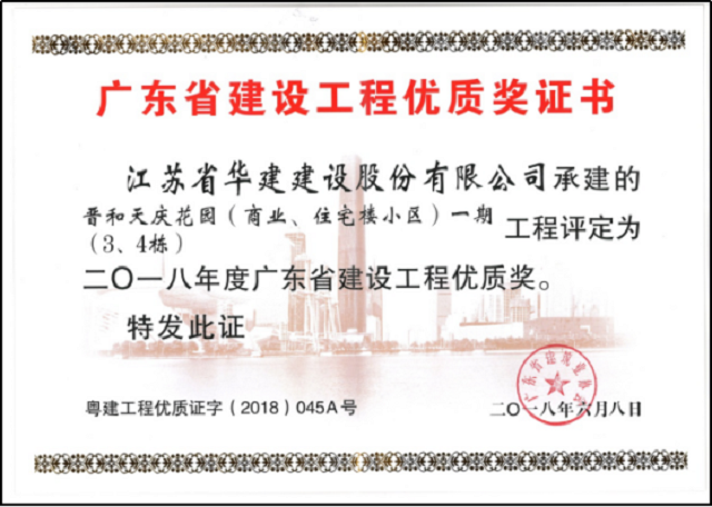 晋和天庆花园一期工程喜获广东省建设工程优质奖 时间:2018-07-25 2567 近日,根据广东省建筑业协会粤建协[2018]49号文件《关于公布2018年度广东省建设工程优质奖名单的通知》,由珠海公司承建的晋和天庆花园一期工程喜获广东省建设工程优质奖。 晋和天庆花园一期工程由珠海区域公司第五项目部负责施工,位于珠海市金湾区三灶镇中心地段,总建筑面积156804.71m2,由8栋高层住宅楼和1栋综合楼组成。 (技术质量处)