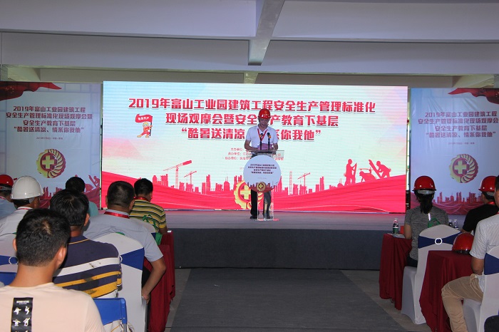 7月8日下午,2019年富山工业园建筑工程安全生产管理标准化现场观摩会暨安全生产教育下基层“酷暑送清凉、情系你我他”活动在公司承建的通得电气富山工业园项目现场隆重举行。富山工业园开发建设局局长霍咏梅,珠海市建筑安全协会秘书长张丽,珠海市建筑安全职业技能培训学校校长江春华,半岛官网入口网页版珠海区域公司总经理吕方达,以及富山工业园区管委会工作人员、建设单位、监理单位、施工单位等200余人参加。