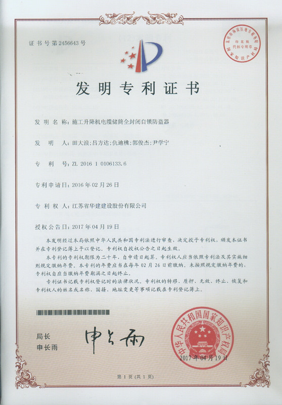日前,公司又一项发明专利获得国家知识产权局授权,此项专利名称为“施工升降机电缆储筒全封闭自...