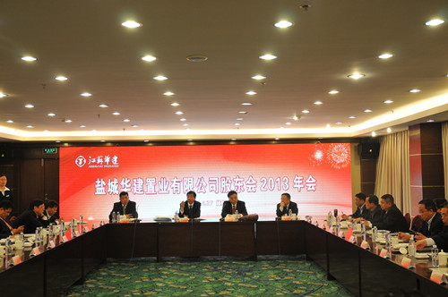 4月27日上午,盐城华建置业有限公司股东会2013年会在扬州召开,华建地产董事长程杰主持会...