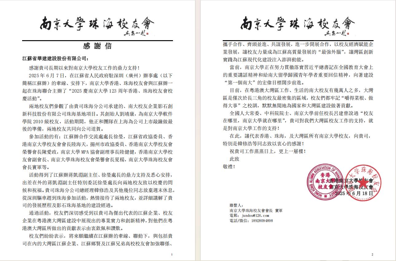 近日,公司收到香港南京大学校友会、南京大学珠海校友会联合发来的《感谢信》。6月7日,在江苏...