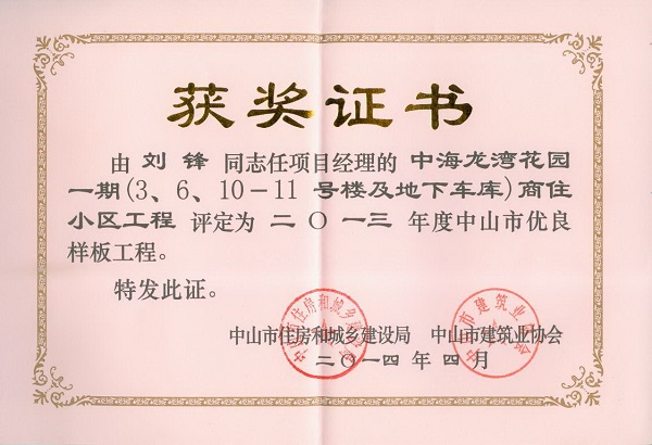 2013年度中海龙湾花园一期商住小区工程中山市优良样板工程