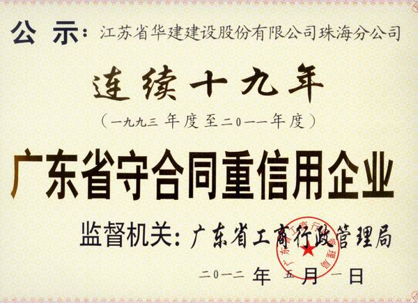 公司连续19年荣获“广东省守合同重信用企业”荣誉称号