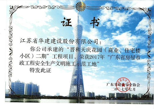 晋和天庆二期获2017年广东省建设工程项目施工安全生产标准化...