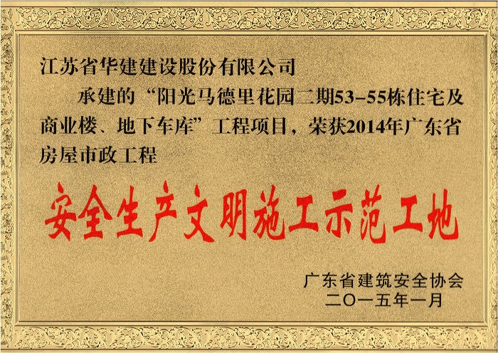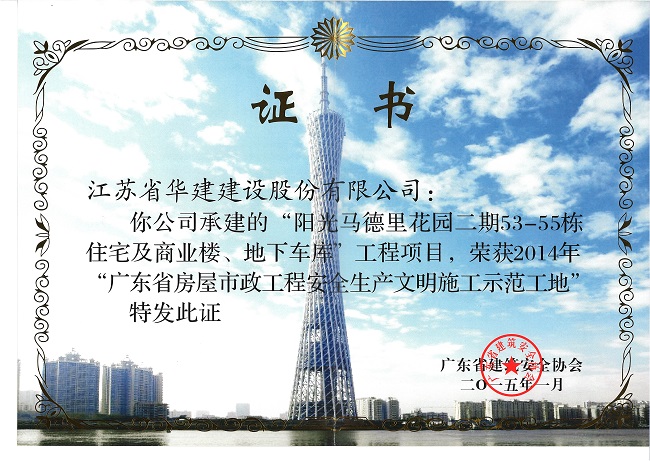 阳光马德里二期工程荣获2014年广东省房屋市政工程安全生产文...