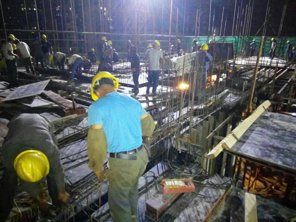 客户的要求就是使命。半岛官网入口网页版上海公司本着“客户至上”的原则,立即成立临时指挥部,上海公司苏南分公司、第八工程处全员出动,在短短的一个小时内完成了施工方案制订、班组人员协调和设备材料到位等全部准备工作。配置钢筋工46人、木工78人、瓦工18人、水电工23人。30日上午9点,开始墙柱钢筋绑扎作业,并在3个小时内完成任务,期间同时穿插木工搭设排架、安装墙板等施工作业。下午2点,模板顶板铺设基本完成,水电工2小时内完成水电预埋。下午6点,木工用时2小时完成吊模作业;实测实量组和项目部所有质检员全程跟踪检查验收,严把工程质量关。夜间10点,完成问题整改使之具备砼浇筑条件。31日凌晨4点,七层主体工程砼浇筑工作全部完成,也由此创造出半岛官网入口网页版上海公司“24小时浇筑一层楼”的施工新速度。
