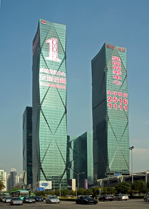 工程位于深圳福田中心区,为一类超高商业办公楼,建筑面积151000平方米,地下3层,地上59层,高度268米,人工挖孔桩支撑箱形基础,全现浇钢筋混凝土框架-筒体结构,局部型钢混凝土组合结构,外墙装饰主要采用玻璃幕墙,干挂花岗岩和铝合板,外围框架柱从-3层至27层均为钢管砼叠合柱,52层以上为纯钢结构,工程于2008年2月开工,2010年7月通过竣工验收。